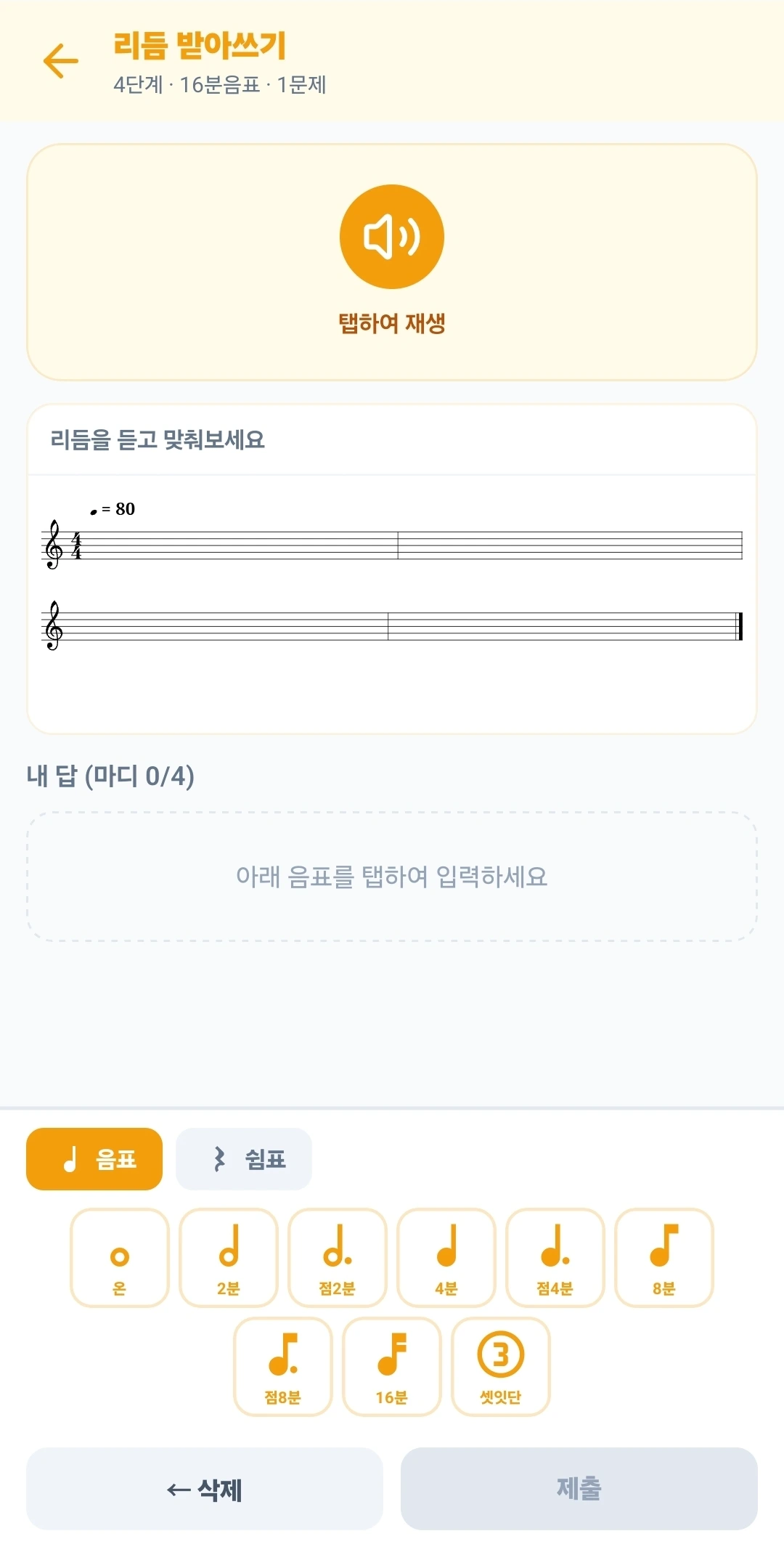 음악을 듣고 정답을 입력하세요. 오선보에 음표를 그리거나, 건반을 누르거나, 선택지를 고르는 다양한 방식으로 답할 수 있습니다.